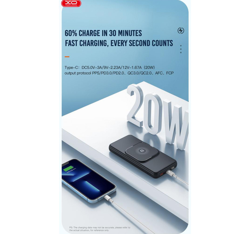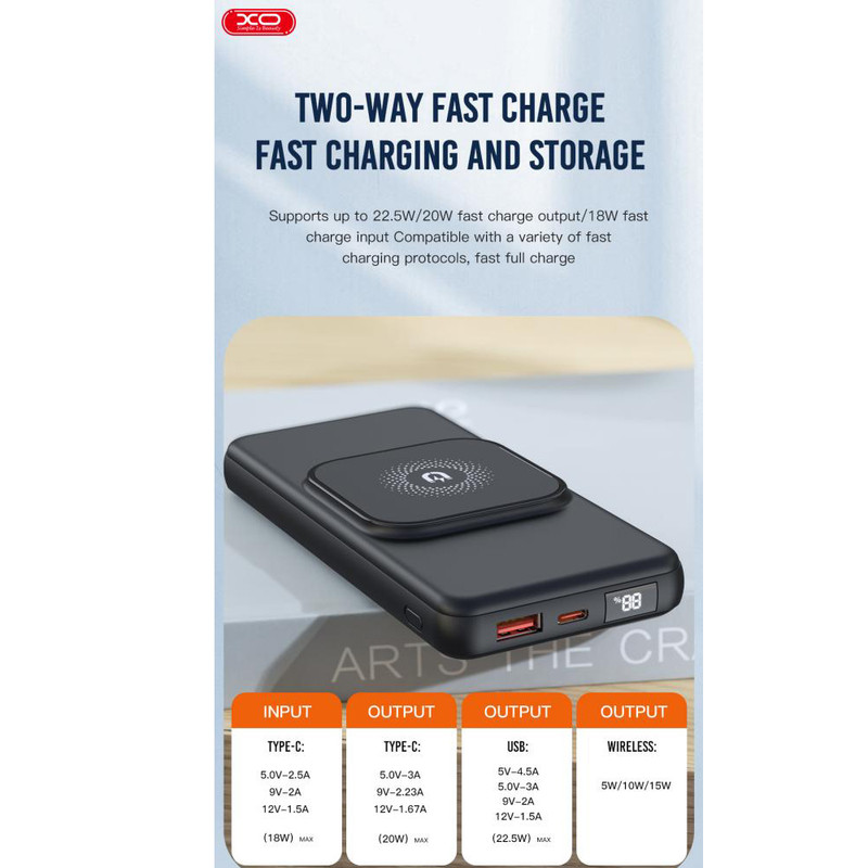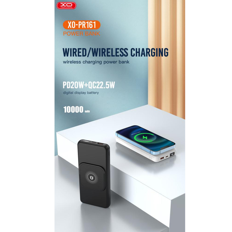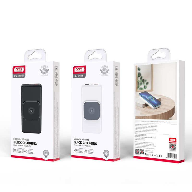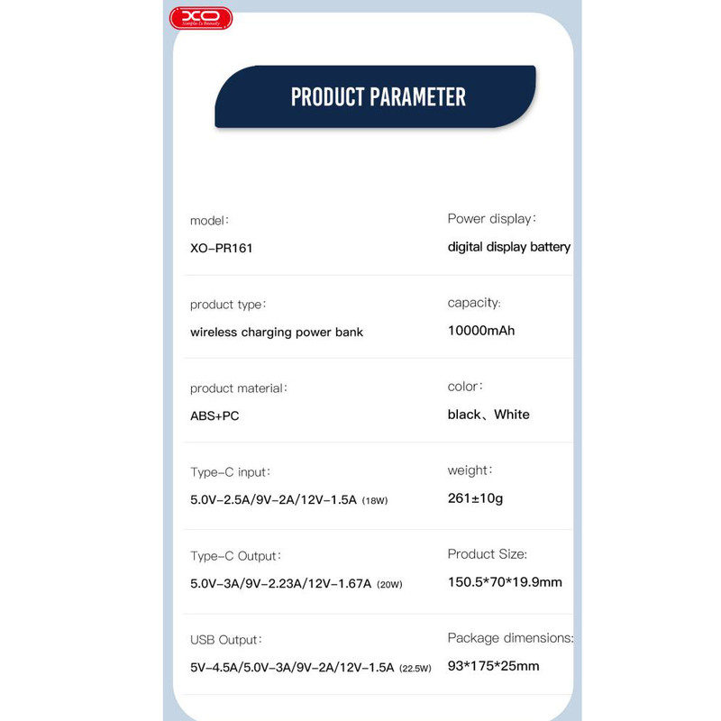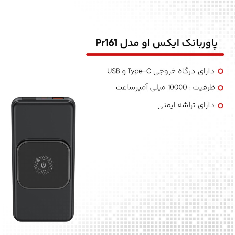 پاوربانک XO PR161 قابلیت شارژ وایرلس مگنتی و MagSafe با حداکثر توان 15 وات دارد و با داشتن 2 پورت خروجی، حداکثر توان خروجی 22.5 وات و ظرفیت اسمی 10000 میلی آمپر ساعت یک پاوربانک چندکاره محسوب می شود. داشتن صفحه نمایش دیجیتالی برای نمایش باتری کامل کننده ویژگی های این پاوربانک است.پاوربانک XO PR161 دارای ظرفیت اسمی به اندازه 10000 میلی آمپرساعت است. البته حتما در نظر داشته باشید ظرفیت اسمی با توجه به ولتاژ شارژ گوشی شما تغییر می کند. پاوربانک وایرلس ایکس او PR161 از ABS و PC ساخته شده است. ابعاد آن برابر 150.5x70x19.9 میلیمتر و وزنی در حدود 261 گرم دارد. برای اطلاع از میزان شارژ پاوربانک XO PR161 نمایشگر دیجیتالی در نظر گرفته شده است که میزان شارژ باقی مانده را به در صد نمایش می دهد.پاوربانک XO PR161 دارای تراشه ایمنی است تا از دستگاه های شما در برابر شارژ بیش از حد، داغ شدن، ولتاژ بیش از و اتصال کوتاه حد محافظت کند.