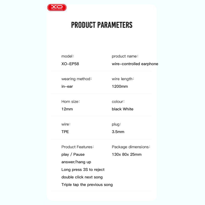 با اینکه در حال حاضر هندزفری های بلوتوثی طرفداران بیشتری دارند اما هنوز افرادی هستند که معتقدند هیچ چیز جای کیفیت و حجم صدای هندزفری های سیمی را نمیگیرد. هندزفری سیمی XO EP58 هم یک هندزفری سیمی از برند معروف ایکس او است. ویژگی های ظاهری هندزفری سیمی XO EP58 از جک 3.5 میلی متری استفاده میکند و سبب میشود که بسیاری از گوشیهای دارای درگاه AUX بتوانند از آن استفاده کنند. بدنه محفظهها رفتار آکوستیک صدا را حفظ میکند و همچنین در برابر ضربه مقاوم است. سری این هندزفری ها دارای سری سیلیکون است و اصطلاحا in-ear است. قرار دادن هندزفری ایکس او EP58 داخل گوش به راحتی انجام می شود و داخل گوش تکان نمی خورد تا با کیفیت خوب به شنیدن موسیقی ادامه دهید. وزن هندزفری کم بوده و با سیم 1.2 متری استفاده را برای شما راحت میکند. جنس سیم آن از TPE می باشد که موجب بالا رفتن کیفیت میکروفون مکالمه شده است و در برابر گره خوردن مقاوم است. پنل کنترل موسیقی همانطور که گفتیم کابل هندزفری سیمی XO EP58 برابر با 1.2 متر بوده و کلید کنترل در امتداد سیم قرار گرفته است. کانکتور کابل از نوع جک 3.5 میلی متری یا AUX است که در بسیاری از گوشی ها وجود دارد. روی پنل کنترلی هندزفری ایکس او EP58 یک کلید قرار دارد که میتوانید برای مدیریت تماس ها و همینطور پخش موسیقی از آنها استفاده کنید.
