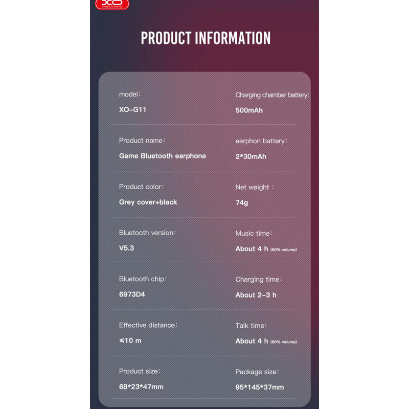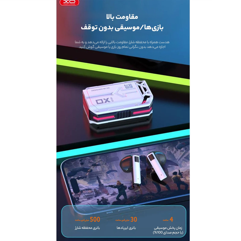 اگر شما یک گیمر خفن هستید هدفون گیمینگ بی سیم XO-G11 یکی از بهترین انتخاب ها برای شماست. قطعا کیفیت صدایی که دریافت می کنید، در برد و باخت بازی شما تاثیر زیادی دارد.این هندزفری بی سیم دارای قابلیت صدای استریو می باشد، شما میتوانید با کیفیت عالی موسیقی دلخواهتان را گوش دهید و حتی می توانید تماس های تلفنی را با کیفیت بالا برقرار کنید و از مکالمه خود لذت ببرید. با ما همراه باشیدتا درمورد این محصول جذاب اطلاعات بیشتری در اختیارتان قرار دهیم.هندزفری بدون سیم ایکس او G11 از فناوری بلوتوث پیشرفته 5.3 بهرمند است، برد اتصال این محصول حدود 10 متر می باشد. این فناوری باعث شد تا این هندزفری از طریق بلوتوث به اکثر دیوایس ها متصل شود.هندزفری گیمینگ G11 با باتری لیتیومی 500 میلیآمپرساعت تولید شده و مدت زمان مورد نیاز برای شارژ کامل باتری 2 ساعت است؛ باتری هر کدام از ایربادها هم 30 کیلی آمپرساعت است. بعد از شارژ کامل هم حدود 3.5 ساعت برای مکالمه جوابگوی شارژ خواهد بود. این هندزفری به وسیله پورت Type-C شارژ می شود. طول عمر بالای این باتری، باعث شده تا با خیال راحت و بدون وقفه بازی کنید و موسیقی گوش کنید.