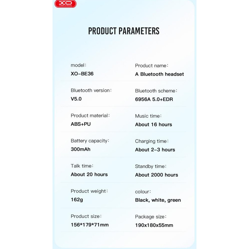 هدفون XO BE36 در کنار وزن سبک طراحی مدرن و جمع و جوری دارد. بالشتک های آن نرم و راحت است و روی گوش اذیت کننده نیست. کاپ های به کار رفته نرم و با کیفیت می باشد و مناسب افرادی است که ساعات زیادی با هدفون سر و کار دارند.این هدفون داری بلند گوی های بزرگ 40 میلی متری که می توانید موزیک خود را با هر میزان صدای با کیفیت خوب گوش دهید. این هدفون XO BE36 داری ابعاد 71x179x156 میلی متر و وزن آن برابر 162 گرم نیز میباشد. جنس این هدست از نوع ABS و pu مقاوم و با کیفیتی ساخته شده است.هدفون بلوتوث ایکس او XO BE36 دارای بلوتوث نسخه 5.0 است و می توان تفاوت اصلی آن را با نسخه های قبلی خود در پیشرفته تر شدن و به روز شدن چیپ بلوتوث آن دانست. با استفاده از این هندزفری می توان تا فاصله ده متری (بدون هیچ مانعی از منبع پخش صدا) بدون افت کیفیت صدا را شنید و به موسیقی گوش داد.