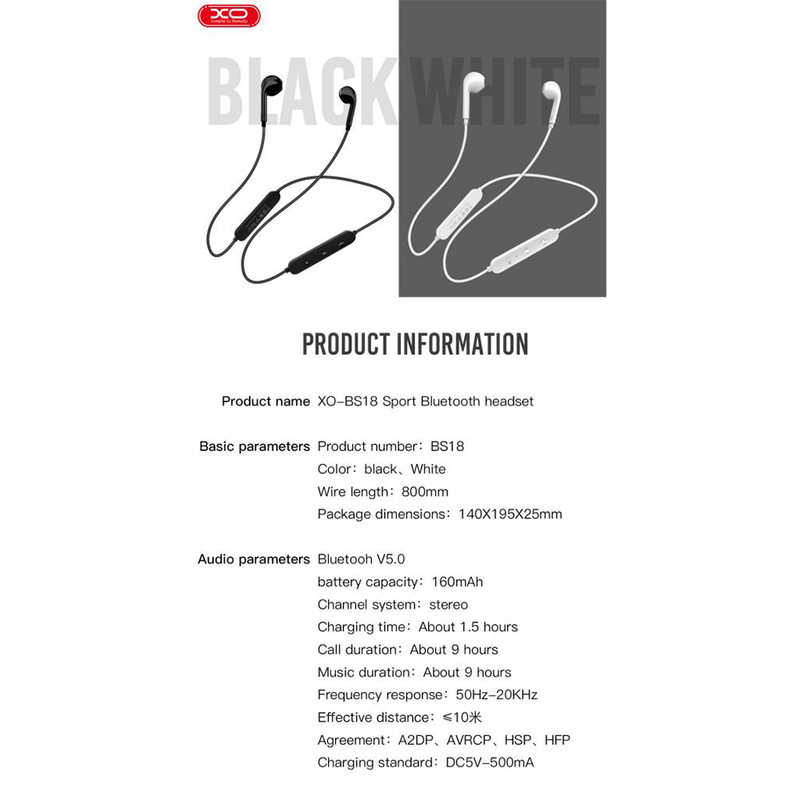 هندزفری های بلوتوث سیمی معمولا مناسب ورزش و فعالیتهایی هستند که نیاز به تحرک دارند. سیم متصل به این هندزفری دور گردن قرار گرفته و از افتادن آن در هنگام ورزش جلوگیری میکند. این هدزفری ها عموما ضد عرق و ضد آب بوده و نگرانی بابت خراب شدن در هنگام تعریق وجود ندارد. هندزفری گردنی ایکس او XO BS18 ساخته شرکت ایکس او است و با طراحی اسپرتی که دارد گزینهای مناسب برای ورزشکاران محسوب میشود. طراحی هندزفری بلوتوث گردنی ایکس او BS18 به صورت گردنی و زیبا طراحی شده است. طراحی این هندزفری ایکس او باعث شده این محصول به هنگام پیاده روی و ورزش نیفتاده و شما با خیالی آسوده از این هندزفری استفاده کنید. در طراحی هندزفری گردنی ایکس او XO BS18 از پلاستیک مقاوم و سیلیکون استفاده شده که با پوست شما سازگار بوده و شما را اذیت نخواهد کرد. سری این هندزفری به صورتی طراحی شده که داخل گوش رفته و نگران افتادن آنها از گوشتان نباشید. بین دو سری یک کنترل پنل برای کنترل تماس، صدا، موسیقی و خاموش و روشن کردن دستگاه تعبیه شده است. البته برای حفظ تعادل هندزفری، یک قسمت به اندازه ی کنترل پنل در بین سری دوم و کنترل پنل در نظر گرفته شده است. اندازه کلی هندزفری گردنی XO BS18 حدود 80 سانتی متر است. بلوتوث و باتری هندزفری گردنی ایکس او XO BS18 دارای بلوتوث نسخه 5.0 می باشد. با استفاده از این قابلیت شما می توانید این هندزفری را به دستگاه مورد نظر خود متصل کرده و از گوش دادن موسیقی لذت ببرید. نسخه 5.0 بلوتوث هندزفری ایکس او باعث اتصال آسان، انتقال وایرلس بالا بدون تداخل سیگنالی شده و از قطع دستگاه به بلوتوث جلوگیری می کند. برد بلوتوث این محصول حدوده 10 متر است. باتری داخلی هندزفری گردنی XO BS18 برابر با 160 میلی آمپر بوده که طبق گفته ی شرکت ایکس او با کامل بودن شارژ این هندزفری شما می توانید تا حدود 8 ساعت از این هندزفری استفاده کنید؛ البته این زمان به میزان بلندی صدا نیز بستگی دارد. برای شارژ کامل این هندزفری 1.5 ساعت شارژ نیاز است. برای شارژ این دستگاه یک درگاه میکرو یو اس بی در قسمت کنترل پنل در نظر گرفته شده است.