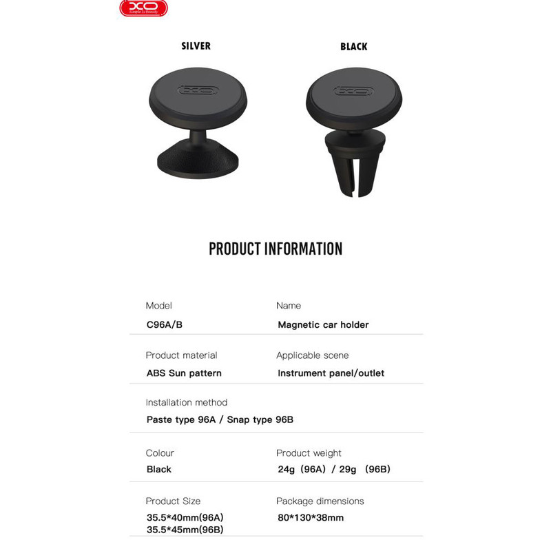 هولدر XO C96B کوچک و جمع و جور است بدون اینکه جلوی دید شما را بگیرد و قسمت نگهدارنده گوشی دارای قابلیت مگنتی است.هولدر XO C96B به صورت دریچه کولری طراحی شده است. در ساخت آن از آهنربا و ABS بهره برده شده است. نصب و راه اندازی آن سریع و بی دردسر است و با یک دست می توانید گوشی خود را بگذارید و بردارید. هولدر ایکس او C96B در جاده های نا هموار نمی افتد. ابعاد هولدر 35.5x45 میلیمتر و وزنی برابر 29 گرم دارد.