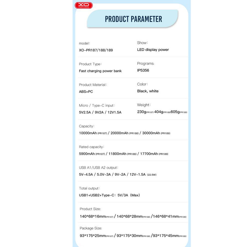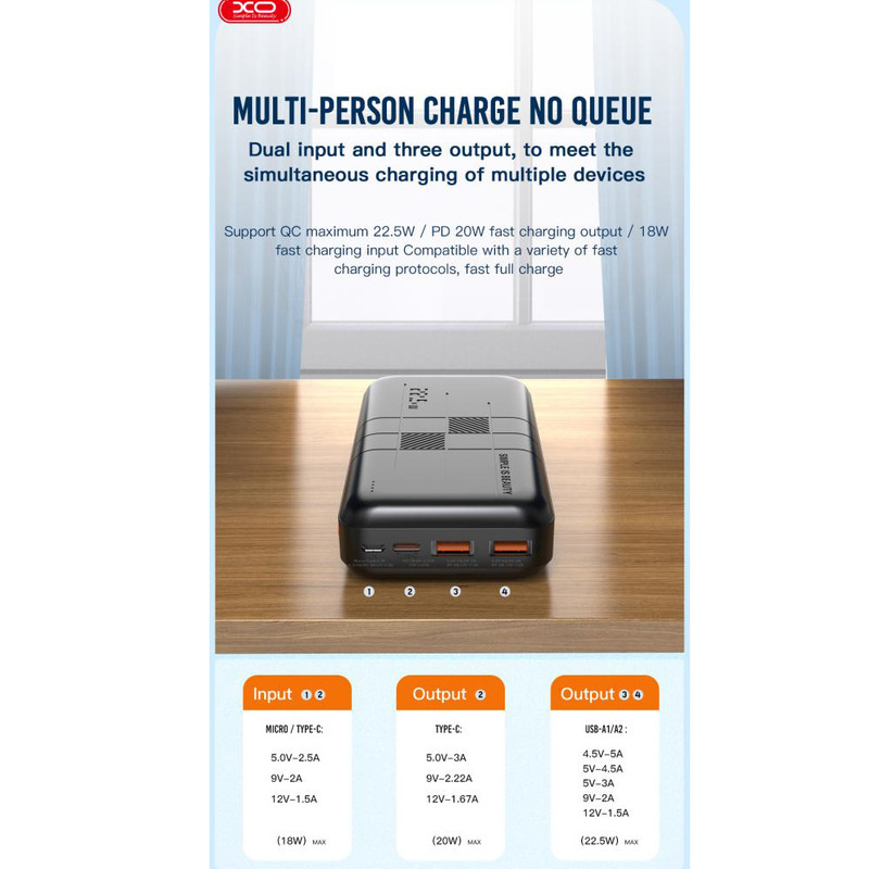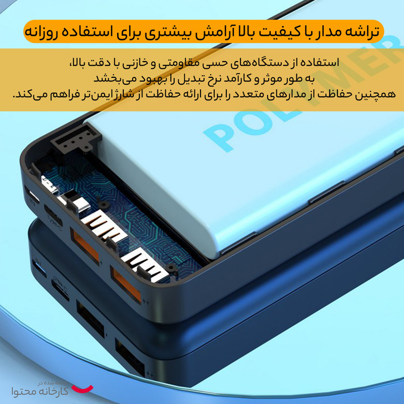 ظرفیت 20000 میلی آمپر ساعت دو درگاه خروجی USB-A و یک درگاه USB-C پشتیبانی از فناوری های شارژ سریع QC3.0 و PD3.0 شارژ خودکار با شدت جریان 2.0 آمپر بدنه مقاوم در برابر ضربه و گرد و غبار